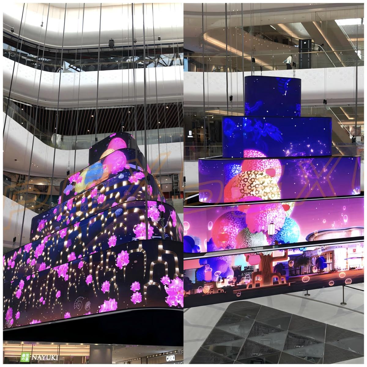 “花系”球形創意屏,巨大的中庭聲光矩陣、高精度的視覺懸浮科技感,實現近似花瓣,遠若燦星的場景感官,結合聲光秀空間環境讓消費者置身于光影藝術之間。