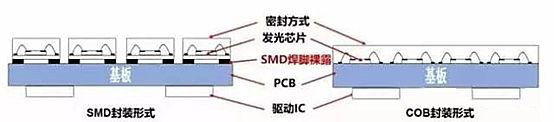 COB封裝工藝的LED顯示屏,很容易做到這點。如果我們有機會把COB的LED顯示屏與SMD的LED顯示屏放在一起,可以很容易發現:COB的LED顯示屏發光柔和像面光源,SMD的LED顯示屏則明顯感覺到發光顆粒是一個個獨立的發光點。從圖3可知道,COB封裝的密封方式和SMD的密封方式有顯著不同。COB封裝的密封方式是很多個發光像素在一起的整體發光面。SMD封裝的密封方式是單個發光像素,是一個個的獨立發光點。