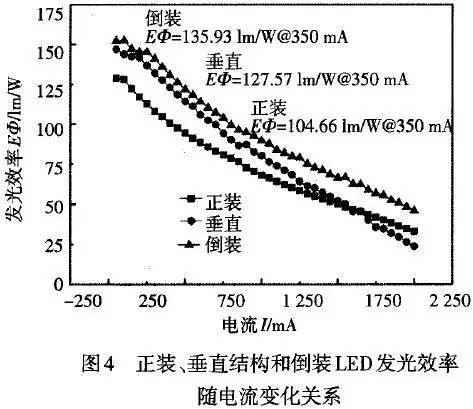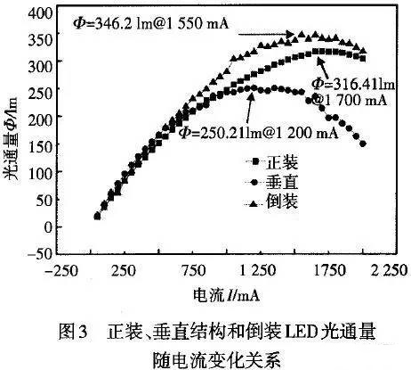 因此,本文對比研究了垂直結構LED和倒裝結構LED隨著電流增大的光輸出變化規(guī)律,并且與普通正裝LED進行了比較,得出了倒裝結構LED具有更好的抗大電流沖擊穩(wěn)定性和光輸出性能。
