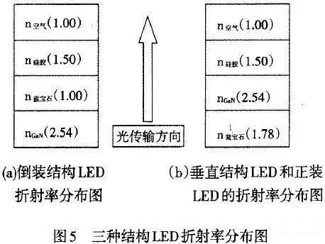 (1)倒裝LED的外量子效率高。三種封裝結構的折射率分布如圖5所示。其中圖5a所示為倒裝封裝結構的折射率分布圖;圖5b所示為垂直封裝結構和正裝封裝結構的折射率分布圖。根據(jù)Snell定律,倒裝LED光從GaN到藍寶石的全反射臨界角θ=sin-1 (n藍寶石/n GaN)=44.5°,藍寶石到封裝硅膠的臨界角為θ=sin-1 (n硅膠/n藍寶石)=57.4°;而垂直結構和正裝LED的光從GaN直接傳輸?shù)椒庋b硅膠層,其全反射臨界角為θ=sin-1 (n硅膠/n GaN)=36.2°,小于倒裝的光傳輸界面的臨界角。較大的臨界角可使更多的光輸出,因此,倒裝結構相較于正裝和垂直結構LED有更高的外量子效率,從而得到了較高的白光發(fā)光效率。