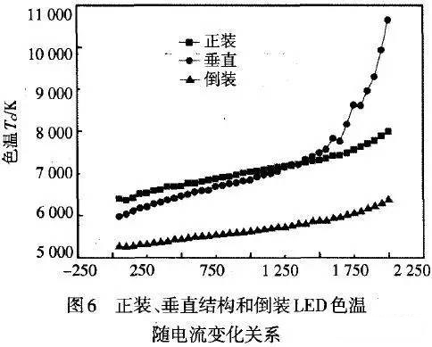 圖6為三種封裝結構LED的電流色溫曲線對比圖。通過實驗測試,隨著驅(qū)動電流的升高,三種封裝結構LED色溫都隨著電流的增加而升高,而倒裝LED的色溫升高斜率最小約為0.40,正裝LED的色溫升高斜率約為0.67,而垂直結構LED在電流小于1 200 mA(光通量飽和點)時色溫增加斜率約為0.84,超過1 200 mA時,色溫參數(shù)接近失效,這與光通量測試和發(fā)光效率測試結果吻合。倒裝LED的色溫飽和點約為1 600 mA,比垂直結構LED的色溫飽和點高出400 mA。說明倒裝LED在較大電流沖擊情況下,光輸出特性比垂直結構LED穩(wěn)定。