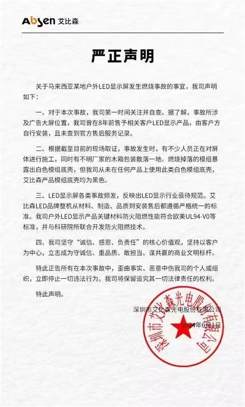 2024年6月1日,艾比森在官方微信公眾號就“關于馬來西亞某地戶外led顯示屏發生燃燒事故的事宜”發布“嚴正聲明”。