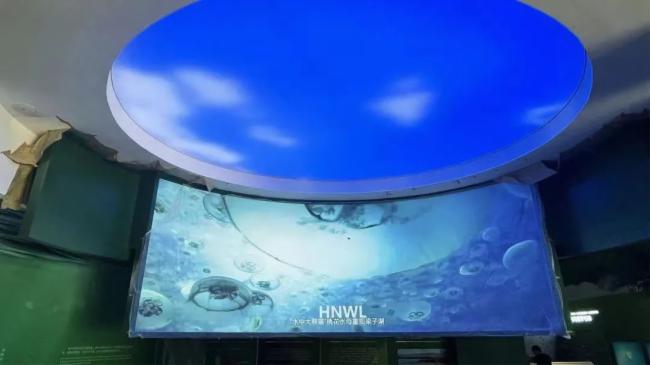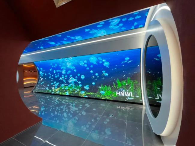 顯屏區域多以異形屏展示為主,相對于傳統的固裝屏而言,異形屏賦予了它更多的“靈性 ”。跟隨著參觀動線的游走,聆聽著專業團隊的講解,輔以LED異形屏的顯示效果,“梁子湖水的浪漫,生態文明的奧秘”逐步呈現。