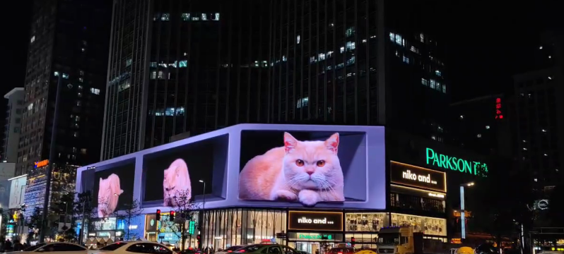 近日成都春熙路百盛購物廣場打造的裸3D大屏。這個寵物胖貓,也不是什么萌寵科幻片,而是由led顯示屏十大品牌邁說光為用戶打造的裸眼3D