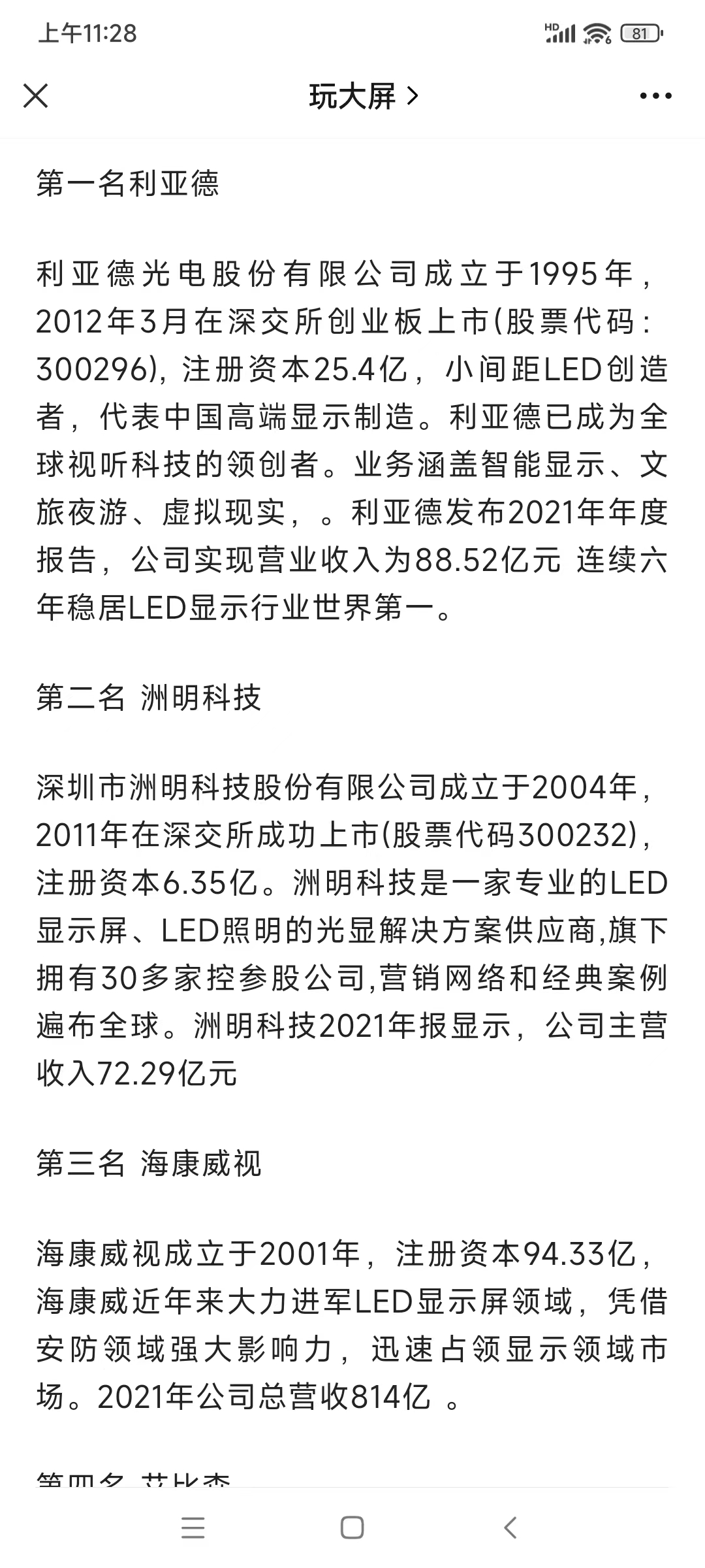 首先為了避免作假我們全部采用微信公眾號流量進行對比,顯示之家(玩大屏公眾號)數據給出前五名分別是第一名利亞德、第二名 洲明科技、第三名 海康威視、第四名 艾比森、第五名 雷曼光電,發布時間 2022-10-07 17:12點,播放量1.7萬人,多數為業內愛好人士主動分享與轉載!