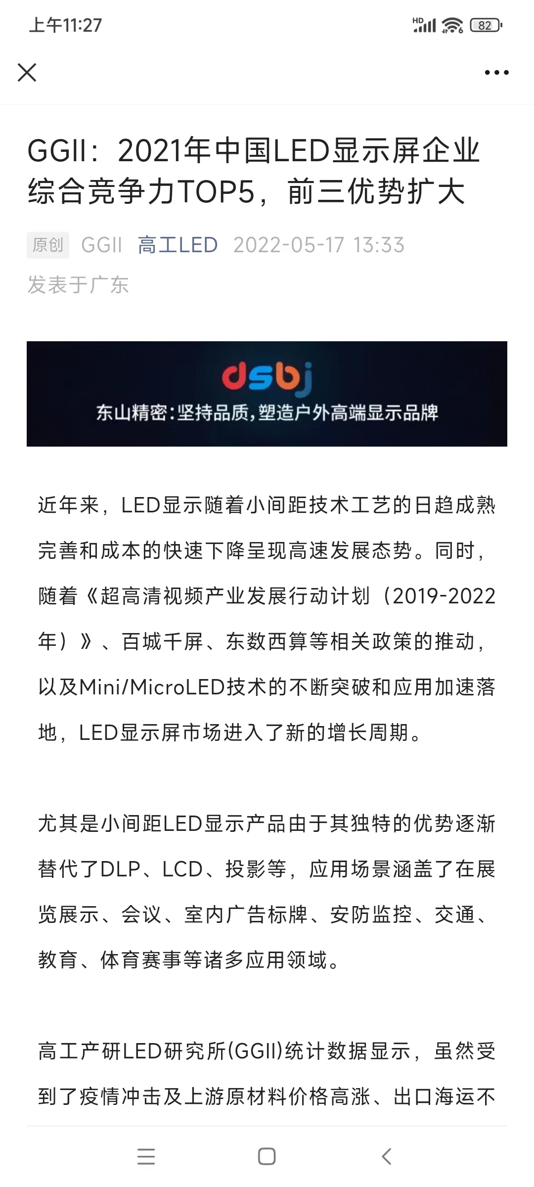我們再看高工LED給出的數據分析第一名強力巨彩、第二名利亞德、第三名洲明科技、第四名海康威視、第五名山西高科,發布時間 2022-05-17 13:33 比顯示之家足足早發布了5個月,瀏覽量僅有4000人,所得流量基本為強力巨彩業務員,各級代理商在瘋狂轉發,我們來看下數據。