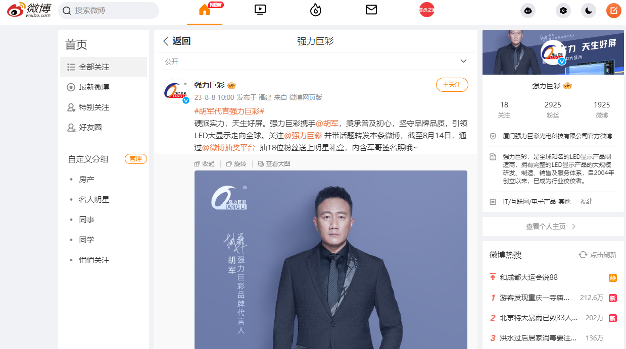 2023年8月8日廈門強力巨彩官網及微博公布聘請胡軍為形象代言人,廈門強力巨彩科技成立于2008年在營業,早期一直以單雙色為主,后來發展全彩屏目前是led顯示屏中低端領域影響力比較大目前在該領域產能排名第二,利用各種網絡營銷提高品牌知名地,可謂被強力巨彩玩的風生水起,現如今明星做代言有為強力巨彩品牌再次提升了一個檔次!
