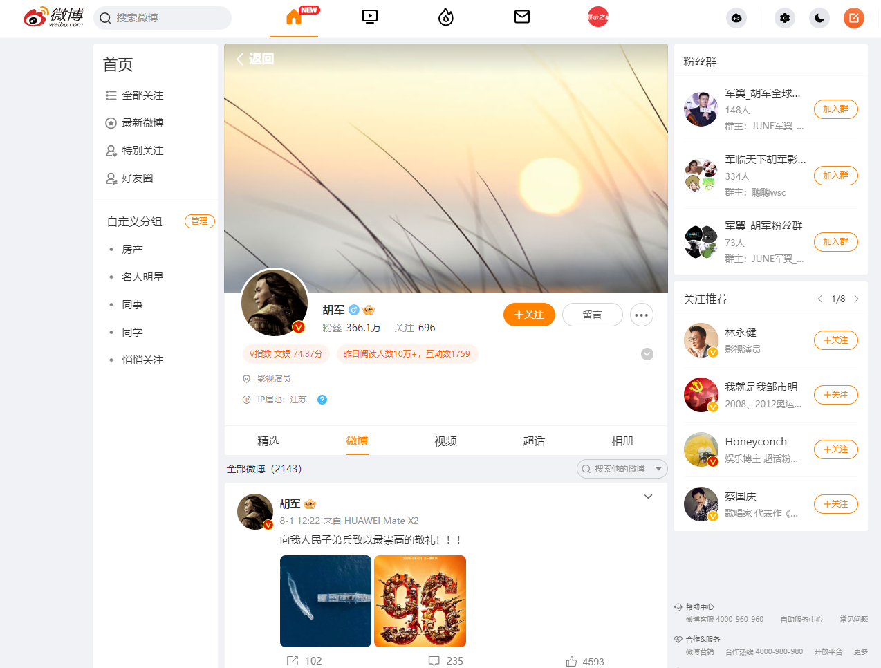 2015年7月胡軍加盟湖南衛視親子戶外真人秀節目《爸爸去哪兒第三季》 [10] 。2016年,主演電視劇《潛伏在黎明之前》。2017年主演電影《上海王》 [11] 。2019年,憑借《音樂家》獲得第三屆“金色銀幕獎”最佳男主角獎 [12] 。2020年4月,主演的經偵題材電視劇《獵狐》播出 [13] ;7月,古裝勵志劇《雪中悍刀行》官宣胡軍為領銜主演 [14] ;8月15日,第8屆溫哥華華語電影節閉幕式暨“紅楓葉獎”頒獎典禮于線上舉辦,胡軍憑借作品《音樂家》獲得“紅楓葉獎”最佳男主角獎 [104] ;同年參演國內首部賀歲輕喜劇《假日暖洋洋》。 [15] 。2021年,與吳京、易烊千璽等合作主演抗美援朝電影《長津湖》上映