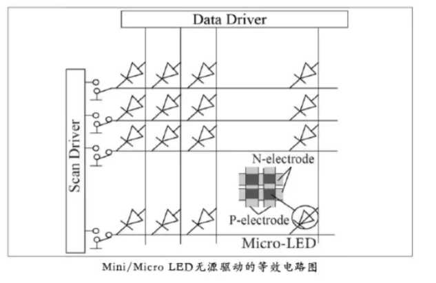 無源驅動方式把每一列像素的陽極(P-electrode)連接到列數據,每一行像素的陰極(N-electrode)連接到行掃描線。某特定的行和列有電流信號通過時,在行列交叉處的像素單元將會被點亮。逐行地對每個像素施加不同的電壓,每個像素能夠實現不同的亮度顯示,以點陣的方式動態顯示圖像。采用Mini/MicroLED無源驅動技術會導致電流密度過高,線間存在串擾,矩陣上不同布線長度的阻抗存在偏差等問題,Mini/MicroLED顯示器的分辨率、亮度、可靠性和畫面質量均受到限制。