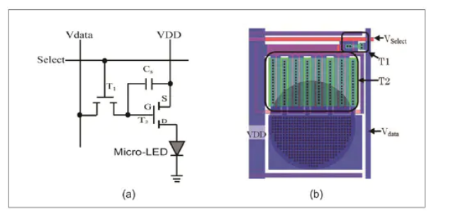 在有源驅動電路中,每一個Mini/MicroLED像素都有各自獨立的驅動電路,雙晶體管單電容2T1C電路是最基本的有源矩陣驅動電路。單個2T1C像素電路使用2個TFT晶體管和1個電容,其中T為開關晶體管,用來控制像素電路的開啟或關閉,T,是驅動晶體管,與電壓源VDD相連,在一幀內為Mini/MicroLED提供穩定的驅動電流,依靠存儲電容Cs來儲存Vdata數據信號。有源驅動方式克服了像素在掃描時存在的串擾問題,讓像素單元有更長的點亮時間,使Mini/MicroLED顯示器擁有更高的顯示亮度。圖(a)顯示雙晶體管單電容器(2T1C)有源矩陣像素電路,有源面板上驅動電路的配置為如圖(b)所示。